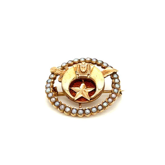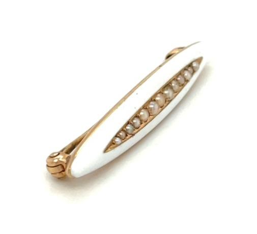 VIctorian 14k Yellow Gold Seed Pearls White Enamel Pin