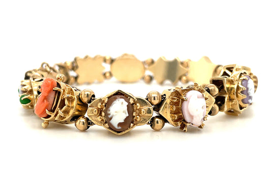 Antique Victorian 14k Gold Cameo Bracelet Coral Jade Shell Filigree 31.7g 7.25”