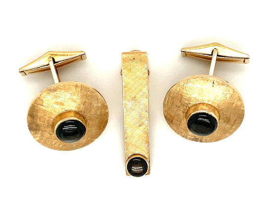 Vintage 14k Yellow Gold Black Sapphire Cufflinks and Tie Bar 14.3g