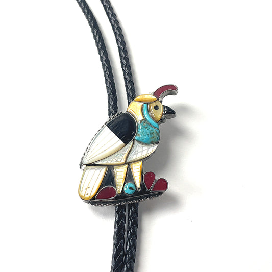 Vintage Southwestern Quail Bolo Tie Turquoise Coral Mother of Pearl Jet Southwestern