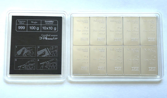 Valcambi Suisse 999 100g Fine Silver CombiBar 10 x 10 g Assay Card Break Apart